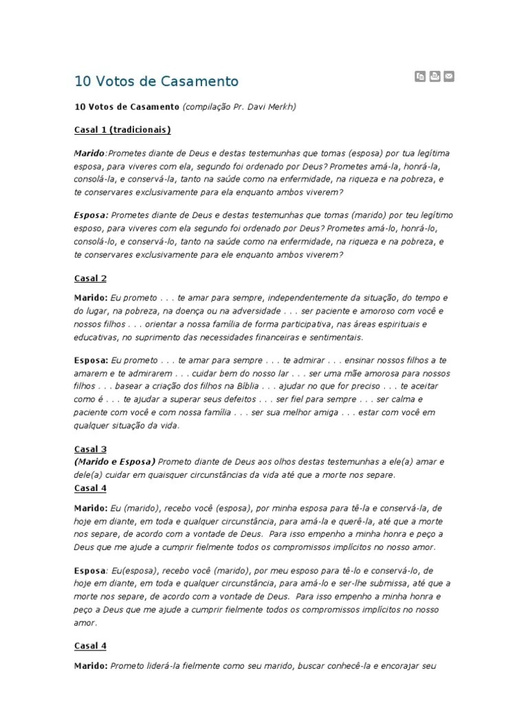 A celebração evangélica tem alguns princípios bastante parecidos com os do católico, e a cerimônia dura em torno de uma hora, e não há uma regra exata sobre a quantidade de músicas que deve ser tocada na celebração, mas em geral, cinco músicas são uma boa escolha. Quero que você utilize livremente em suas pregações e possa transformar a vida das pessoas com a palavra de deus. Como foi deus quem chamou, não tenho desculpas para não fazer isso. Realizar a felicidade do homem e da mulher e proporcionar companheirismo e ajuda mútua. A palavra de deus diz que nossa "palavra seja sempre agradável, temperada com sal, para saberdes como deveis responder a cada um" (colossenes 4.6).existem palavras que amargam a convivência, por isso é necessário ter muito cuidado para que o casamento não perca o gosto ou se torne ruim. Esta, afinal, é osso dos meus ossos e carne da minha carne;. O casamento é nosso maior ministério!